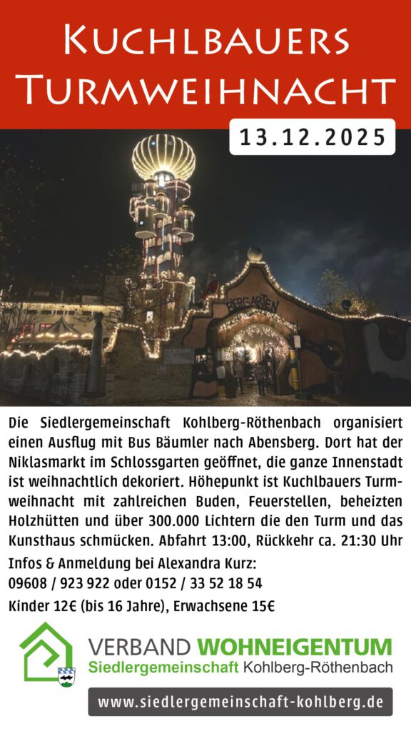 - Busfahrt zu Kuchlbauers TurmweihnachtAktuell sind bereits beide Busse voll, gerne kann man sich aber noch auf die Warteliste setzen lassen.